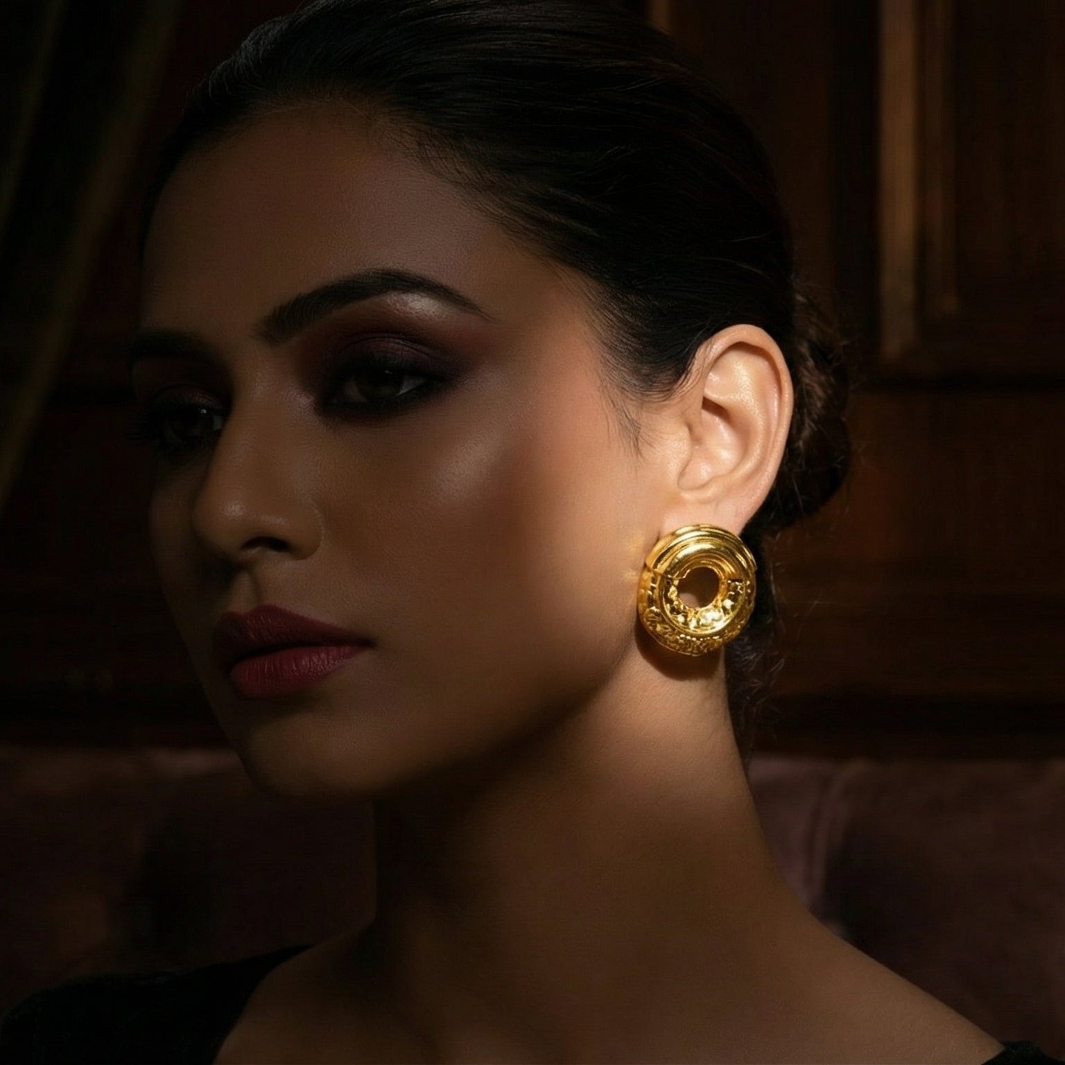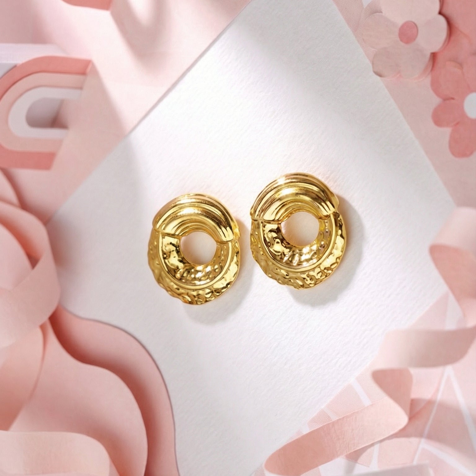 Embrace organic beauty with our Gilded Hammered Halo Studs. These unique circular earrings feature a rich, hand-crafted texture on one half, contrasted by smooth, polished ridges on the other. Their molten-gold appearance adds a touch of raw, artisanal luxury to any ensemble.