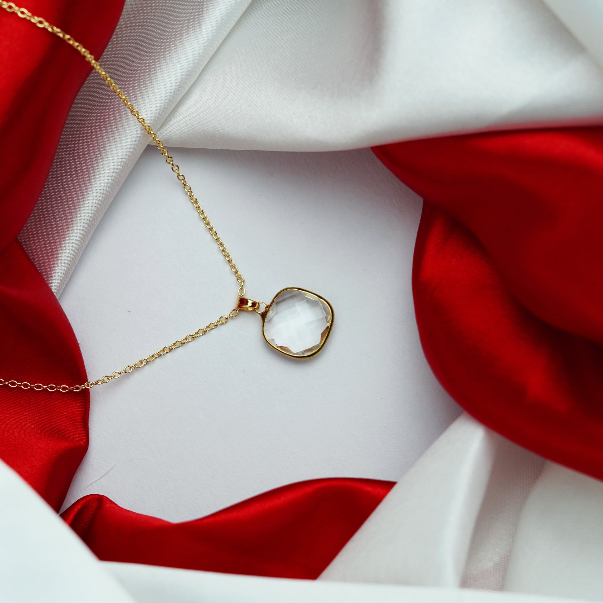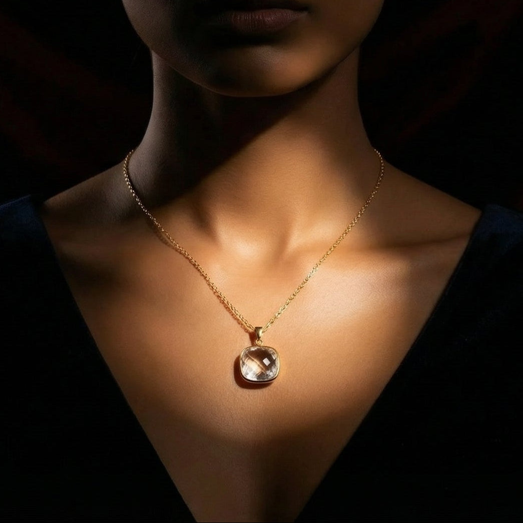 Grace your neckline with the soft, ethereal glow of our Aura Pendant. This exquisite necklace features a stunning cushion-cut crystal with intricate facets meticulously designed to catch and reflect light from every angle. Encased in a minimal, high-polish gold-toned bezel and suspended from a delicate cable chain, it is a statement piece that radiates timeless femininity and grace.